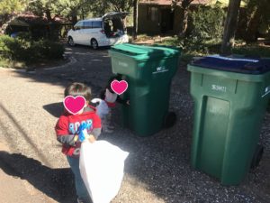 子供たちはごみ捨てをお手伝いします。
