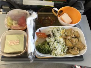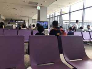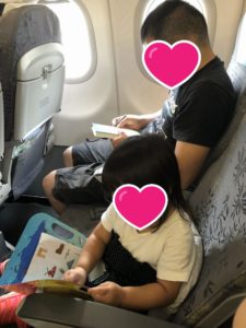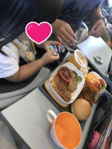 前後の席で兄妹ケンカをしたりして機内を楽しみます。