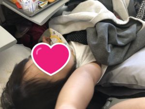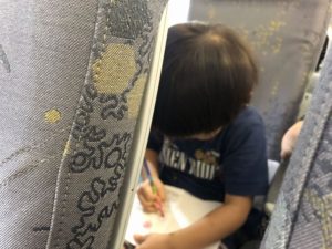 二人ともCAさんからもらったシールや塗り絵に夢中です。