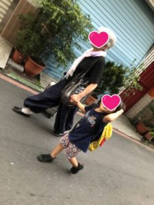 ぺこちゃんとおずおすと手をつなぐ息子。微笑ましい。